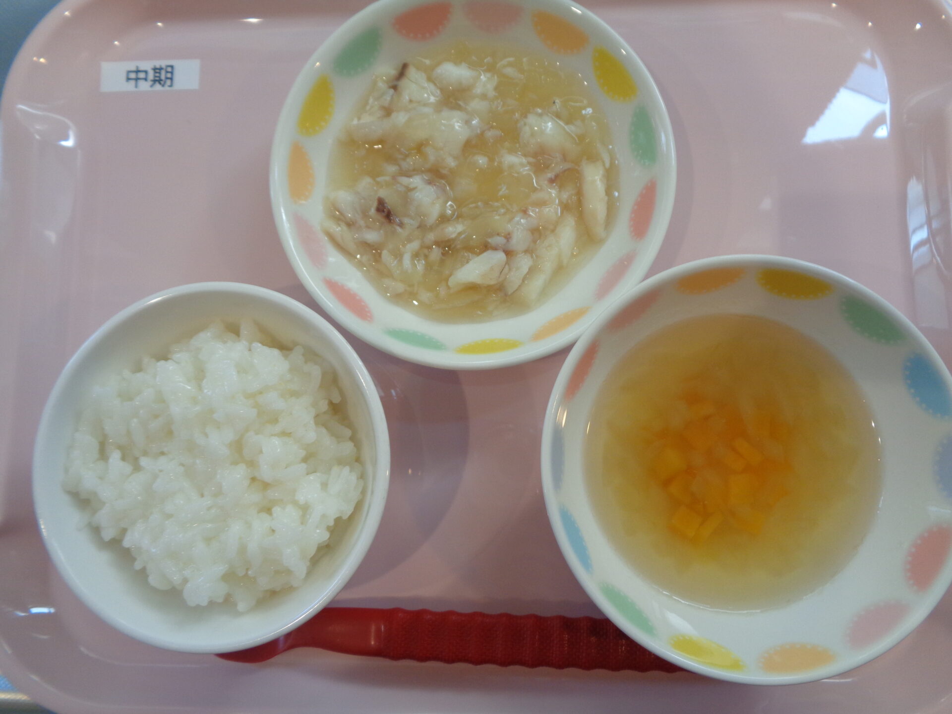 2024.11.22 給食写真 2024年11月 給食 【普通食】 ご飯・さわらの塩麴焼き・かにかまときゅうりの酢の物・さつま芋の味噌汁(園で収穫したさつま芋) 【離乳食・中期】 おかゆ・たいの煮物・さつま芋のスープ 一覧へ戻る