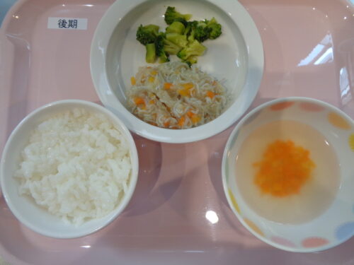 2024.11.30 給食写真 2024年11月30日 給食 【普通食】 ごはん、クリームシチュー、切り干し大根の塩昆布和え、みかん缶 【後期食】 軟飯、しらすとじゃがいもの煮物、ブロッコリー、かぼちゃスープ 一覧へ戻る