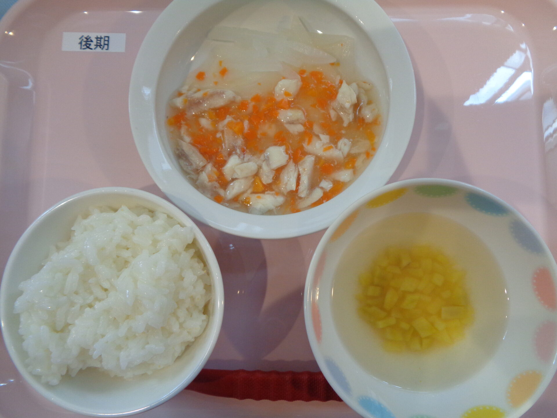 軟飯・カレイとにんじんの煮物・大根スティック・さつま芋のすまし汁