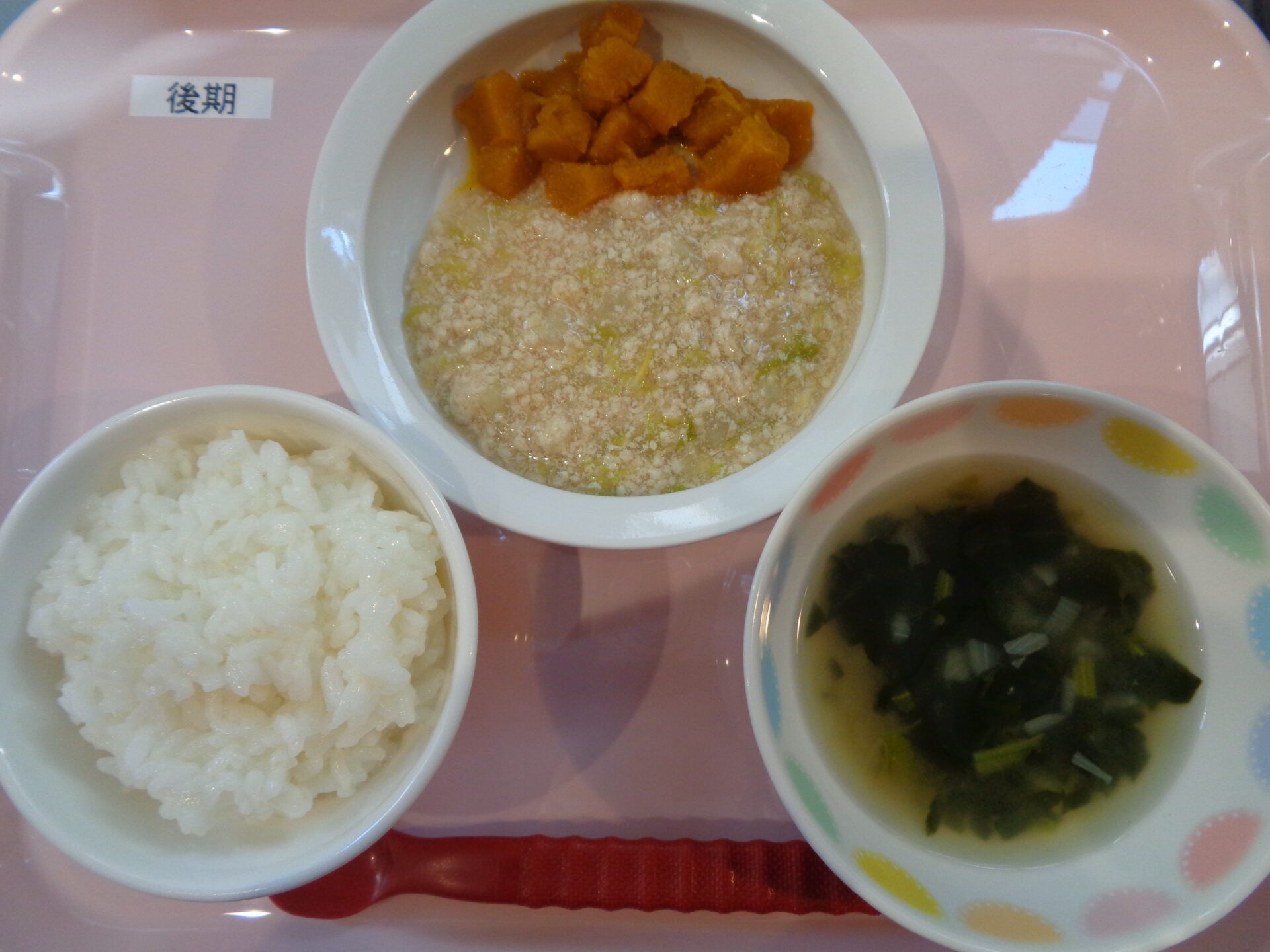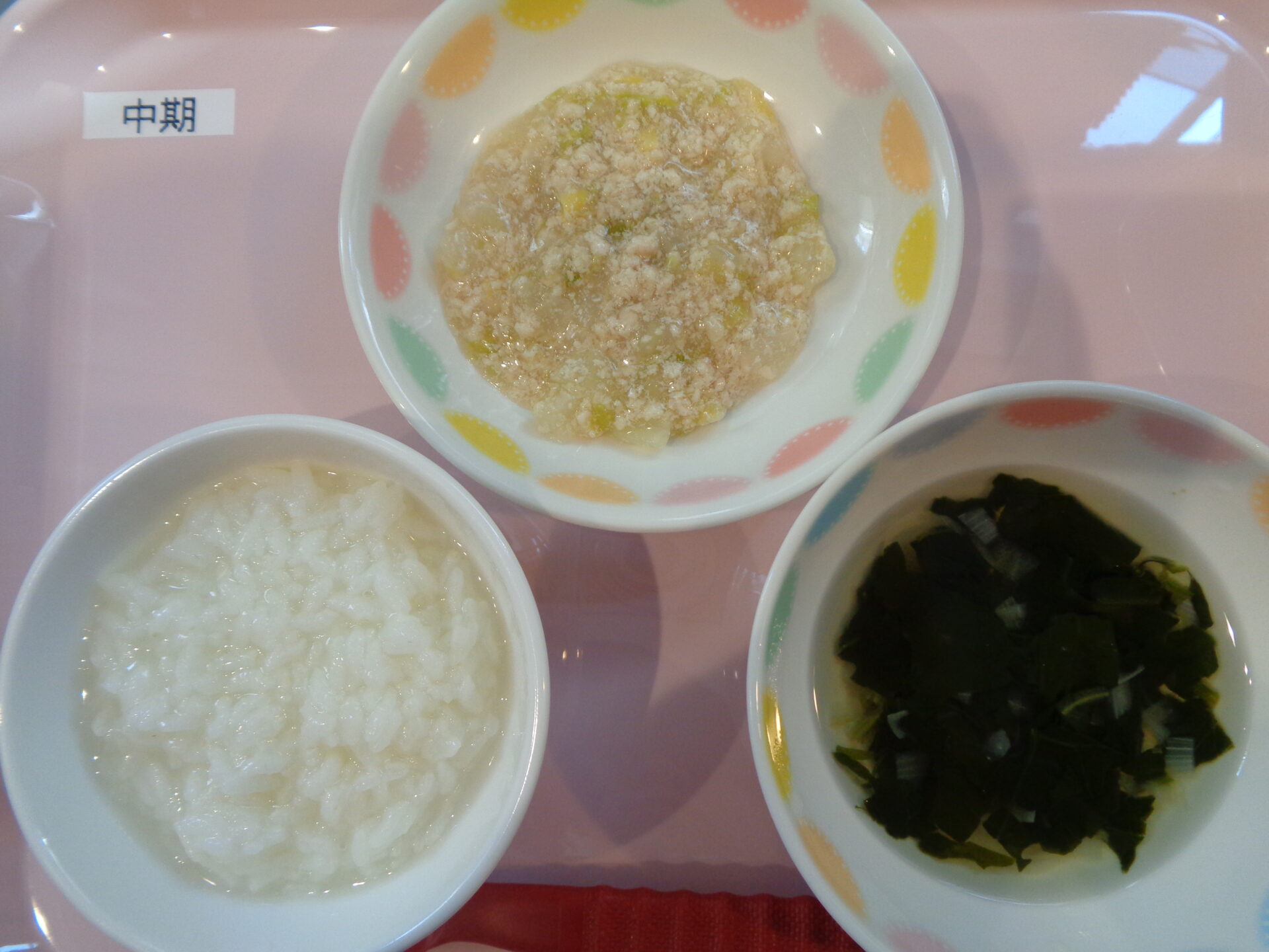 おかゆ・鶏肉と白菜の煮物・ほうれんそうのスープ