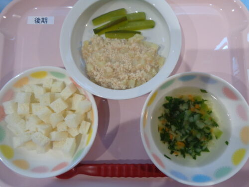 2024.12.06 給食写真 12月6日 給食 【普通食】 ・鶏肉のマーマレード焼き ・ポテトサラダ ・コンソメスープ 【後期食】 ・ささみとじゃが芋の煮物 ・きゅうりスティック ・チンゲン菜スープ 一覧へ戻る