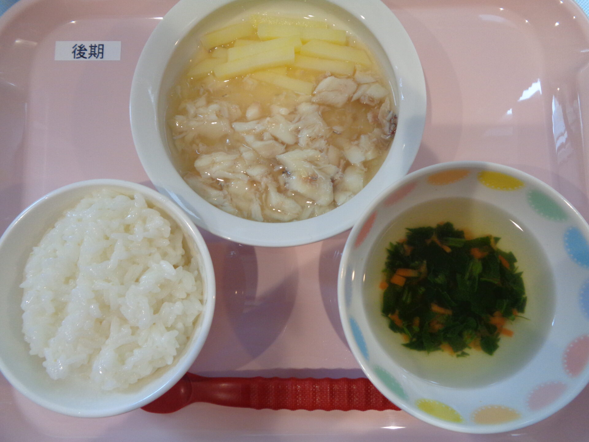 2024.12.11 給食写真 2024年12月11日 給食 【普通食】 ご飯・たいのみそ焼き・じゃが芋の旨煮・そうめん汁 【離乳食・後期】 軟飯・たいの煮物・じゃが芋スティック・ほうれん草スープ 一覧へ戻る