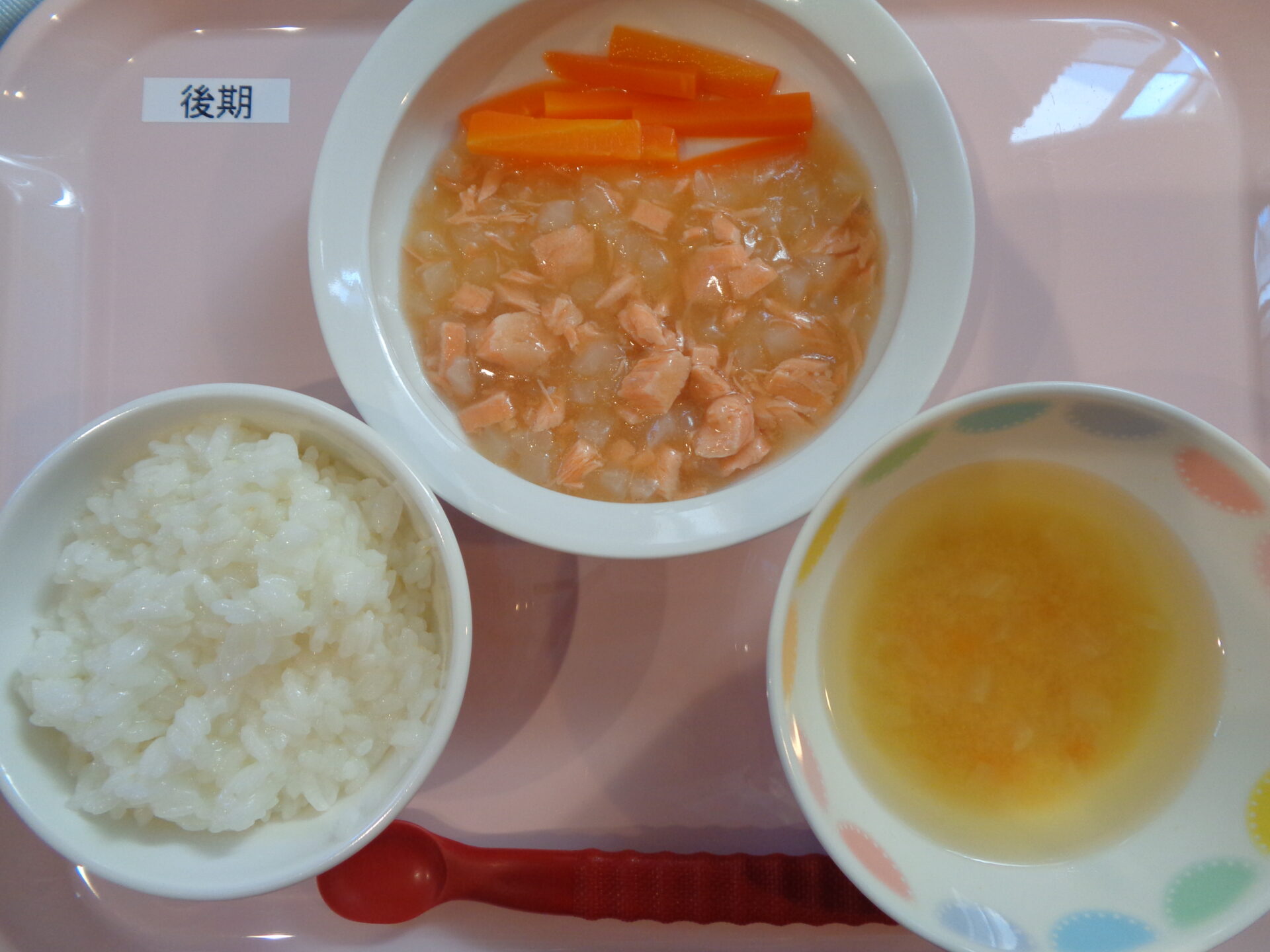軟飯・鮭とかぶの煮物・にんじんスティック・かぼちゃの味噌汁