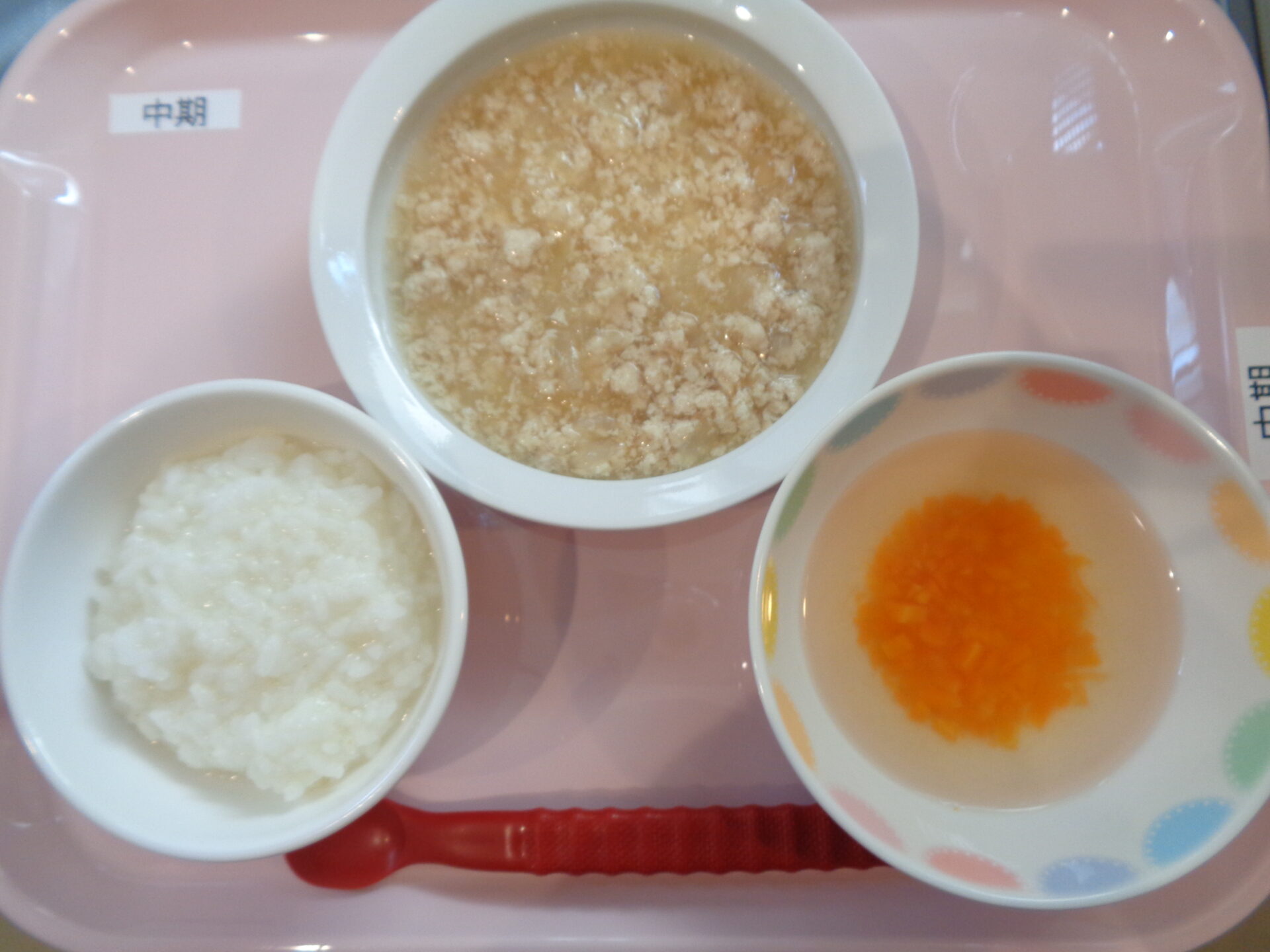 おかゆ・豚肉と玉ねぎの煮物・にんじんスープ