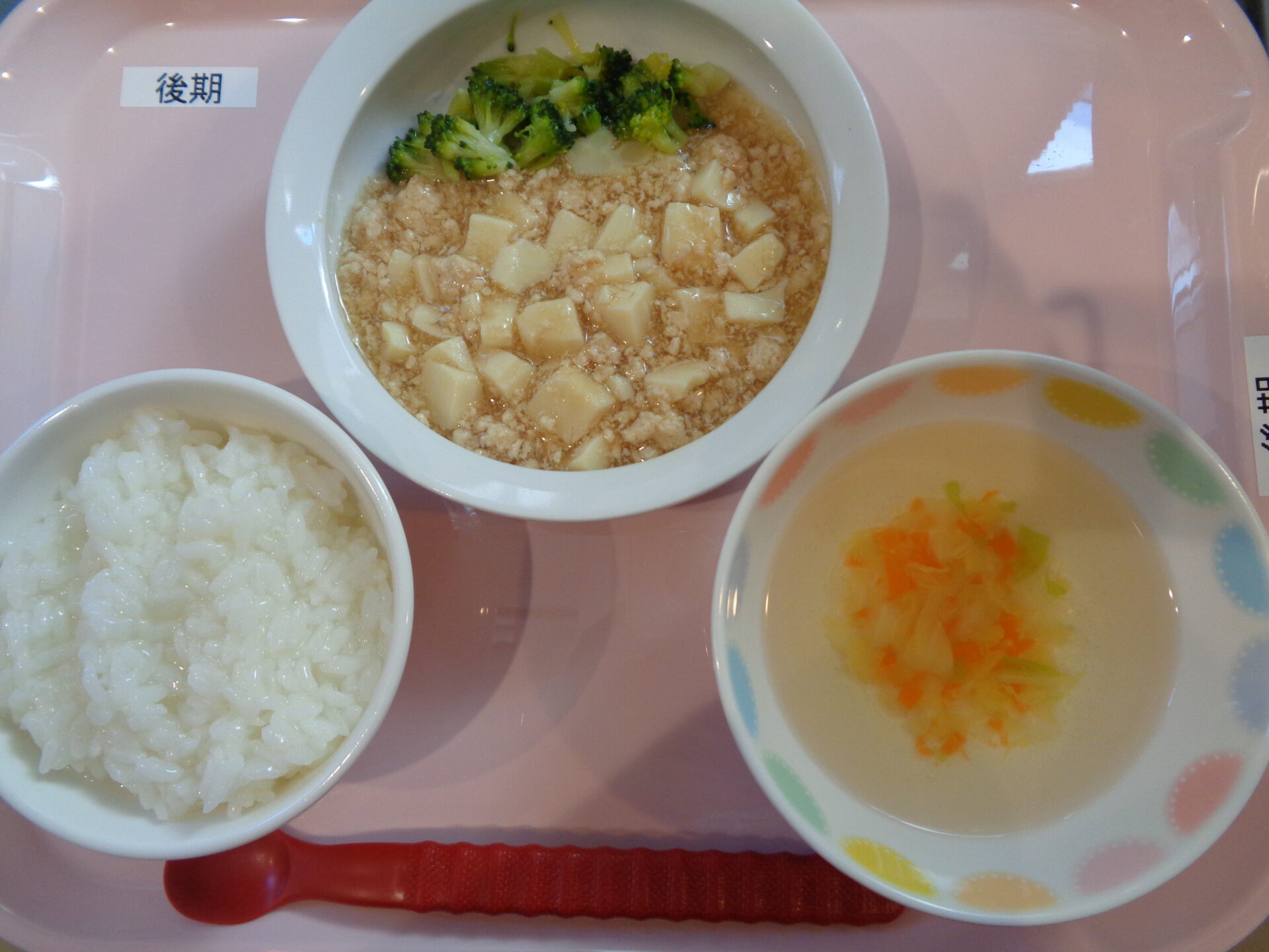 2024.12.23 給食写真 2024年12月23日 給食 【普通食】 マーボー丼・ブロッコリーの中華和え・春雨スープ 【離乳食・後期】軟飯・鶏肉と豆腐の煮物・ブロッコリースティック・白菜のスープ 一覧へ戻る