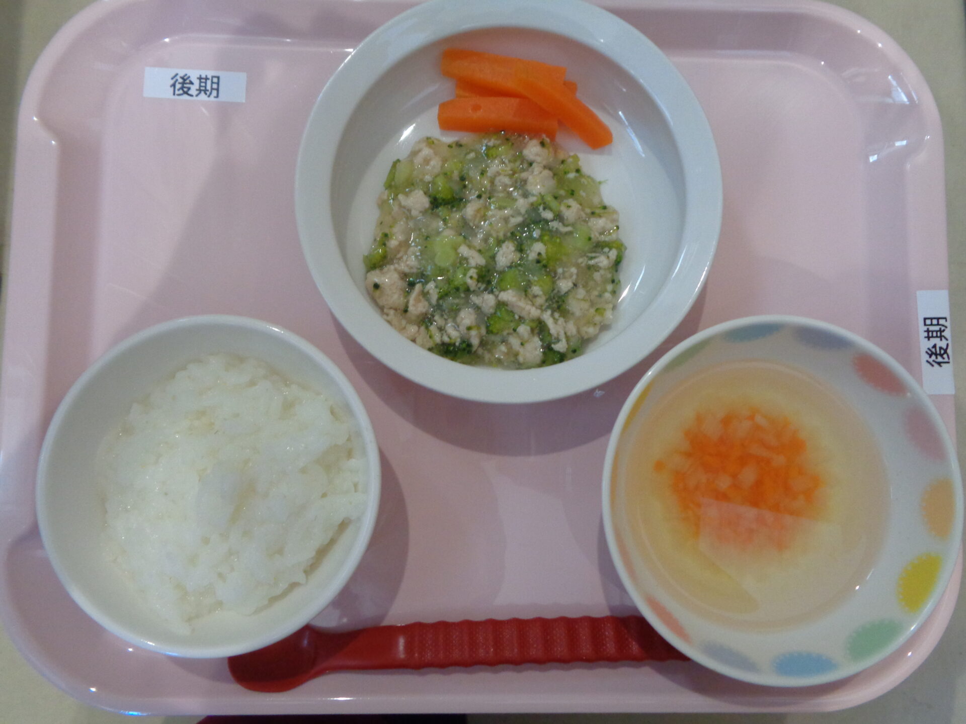 軟飯・鶏肉とブロッコリーの煮物・にんじんスティック・コンソメスープ