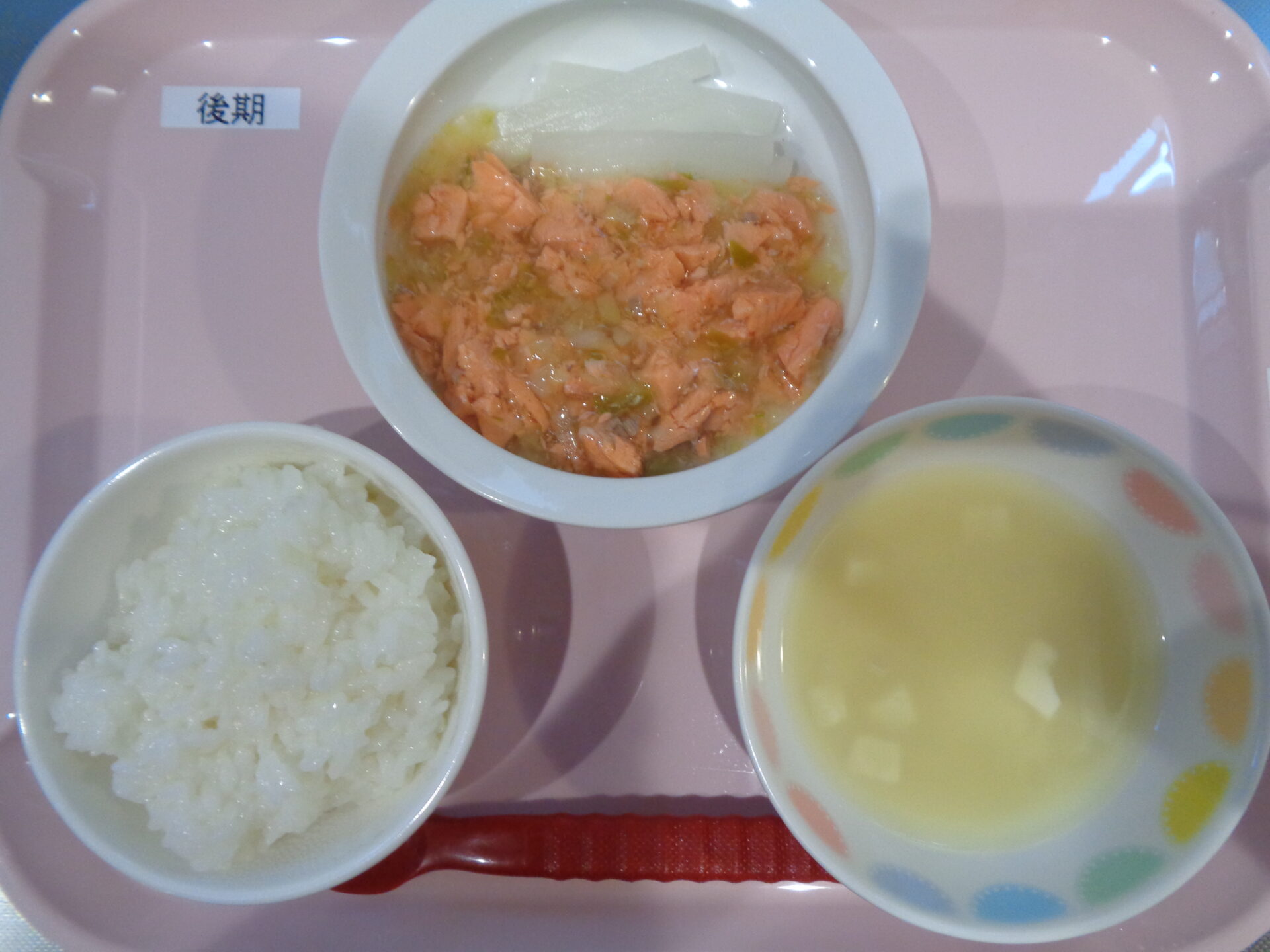軟飯・鮭の煮物・大根スティック・豆腐の味噌汁