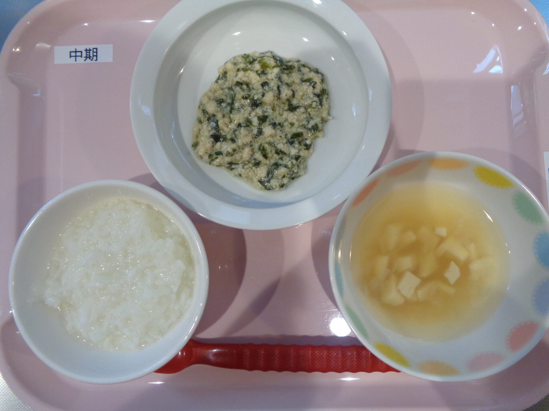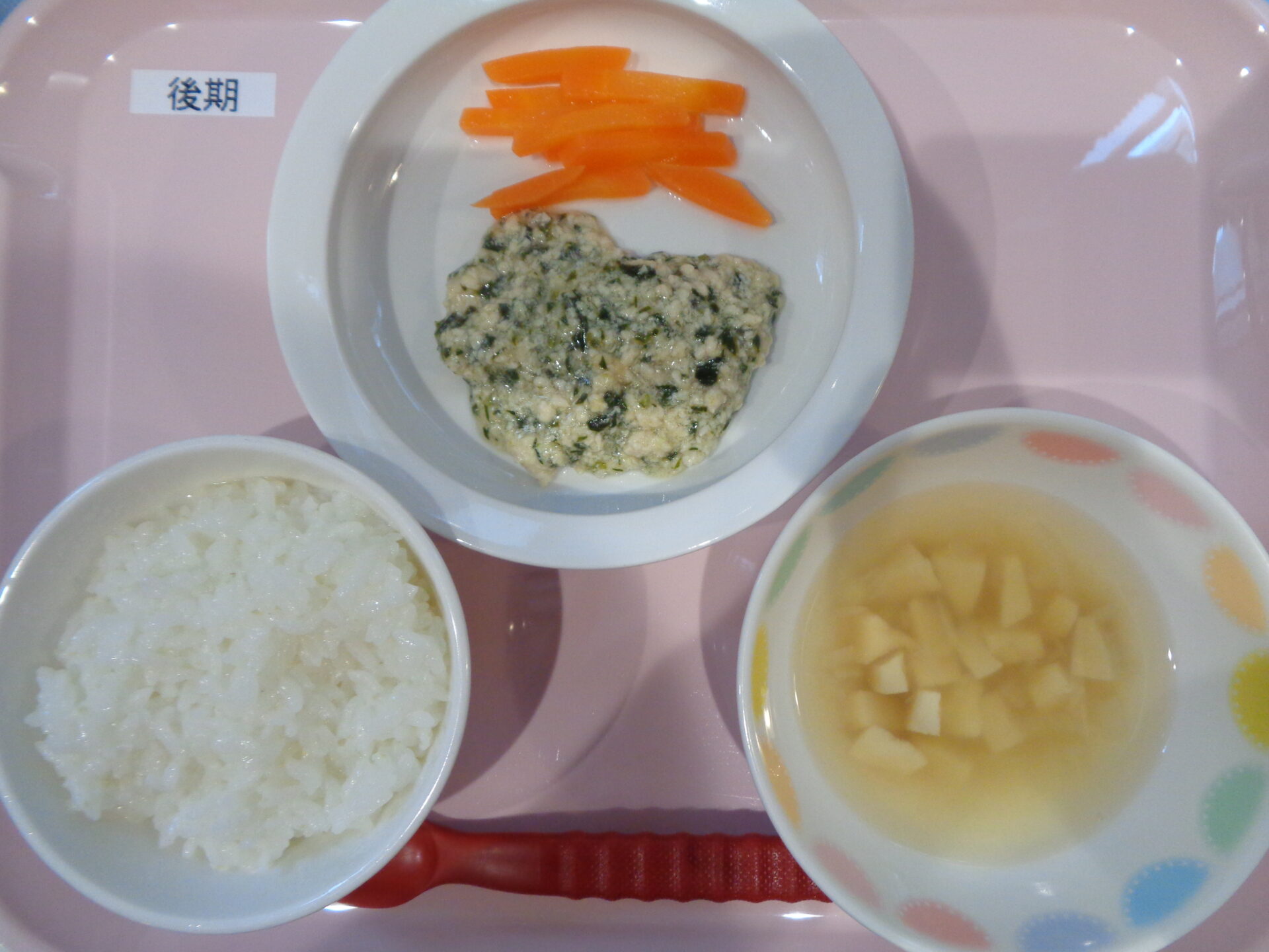 2025.01.15 給食写真 2025年1月15日 給食 【普通食】 ご飯・鶏肉の黄金焼き・千草和え・すまし汁 【離乳食・後期】 軟飯・鶏肉とほうれん草の味噌煮・にんじんスティック・すまし汁 【離乳食・中期】 お粥・鶏肉とほうれん草の煮物・すまし汁 一覧へ戻る
