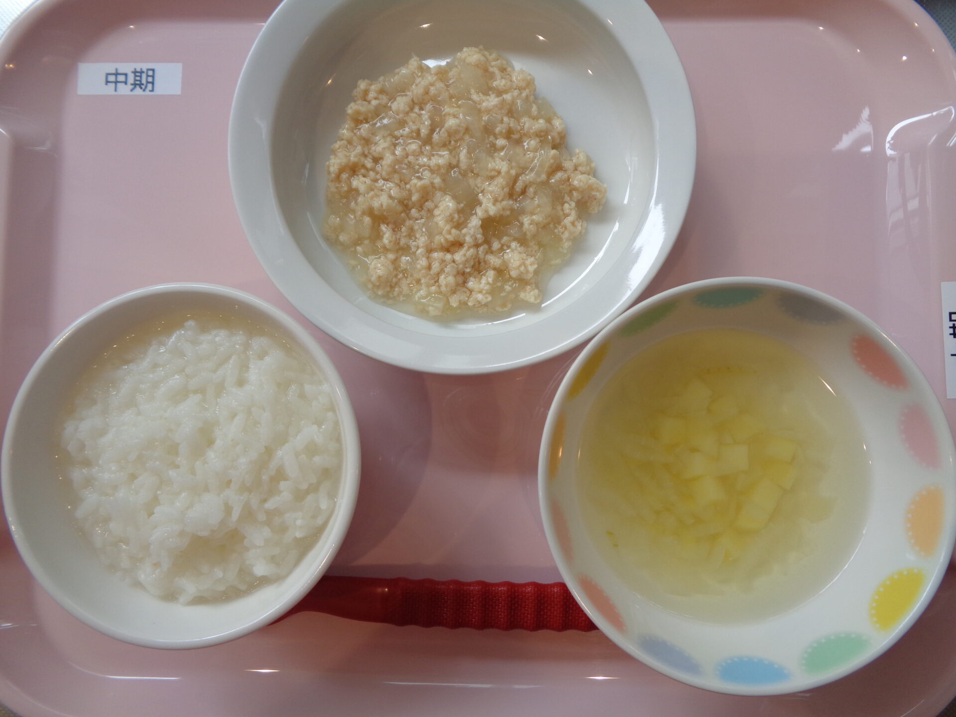 2025.02.21 給食写真 2025年2月21日 給食 【普通食】 ごはん・豚肉のマーマレード炒め・切り干し大根のサラダ・じゃがいもの味噌汁 【離乳食・中期】 お粥・鶏肉と玉ねぎの煮物・じゃがいものすまし汁 一覧へ戻る