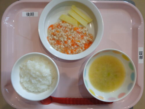 2025.03.05 給食写真 3月5日 給食 【普通食】 ・ご飯 ・鶏むね肉のタツタ焼き ・ツナサラダ ・じゃが芋の味噌汁 【後期食】 ・軟飯 ・鶏肉と人参の煮物 ・じゃが芋スティック ・キャベツの味噌汁 一覧へ戻る