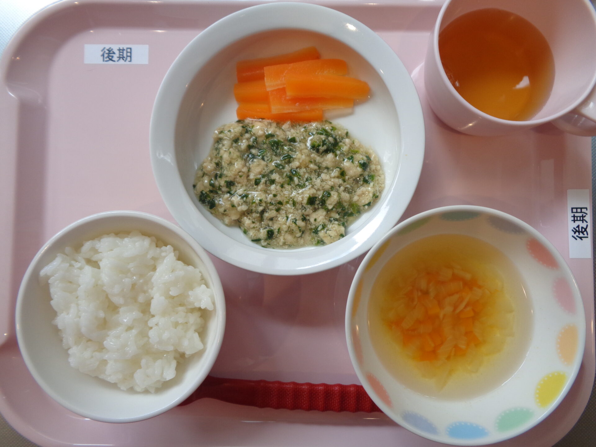 2025.04.02 給食写真 4月2日(水) 【 普通食 】ご飯・鶏肉の香味焼き・ほうれん草の胡麻和え・かぼちゃのすまし汁 【 離乳食・後期 】軟飯・鶏肉とほうれん草の煮物・にんじんスティック・かぼちゃのすまし汁 一覧へ戻る