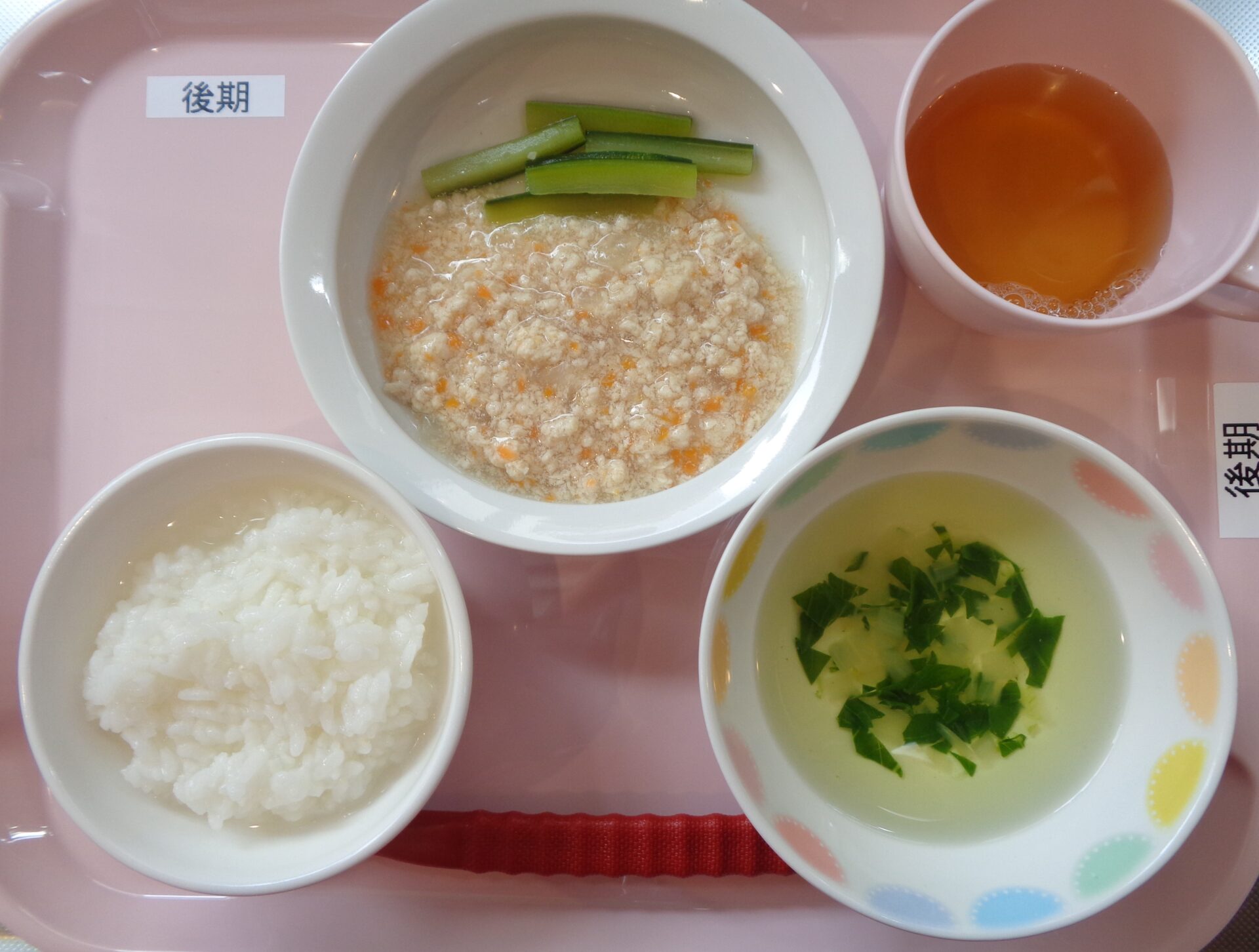 2025.04.03 給食写真 4月3日(木) 【普通食】スパゲティミートソース・切干大根のサラダ・鶏肉と野菜のスープ 【離乳食・後期】軟飯・鶏肉と人参の煮物・きゅうりスティック・チンゲン菜のスープ 一覧へ戻る