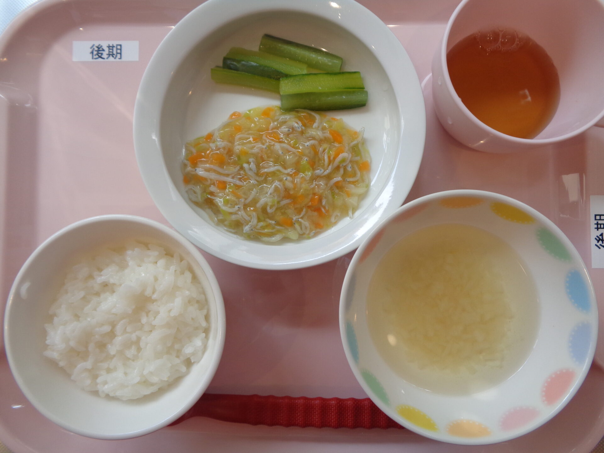 【離乳食・後期】 軟飯・しらすと野菜の煮物・きゅうりスティック・じゃが芋の味噌汁