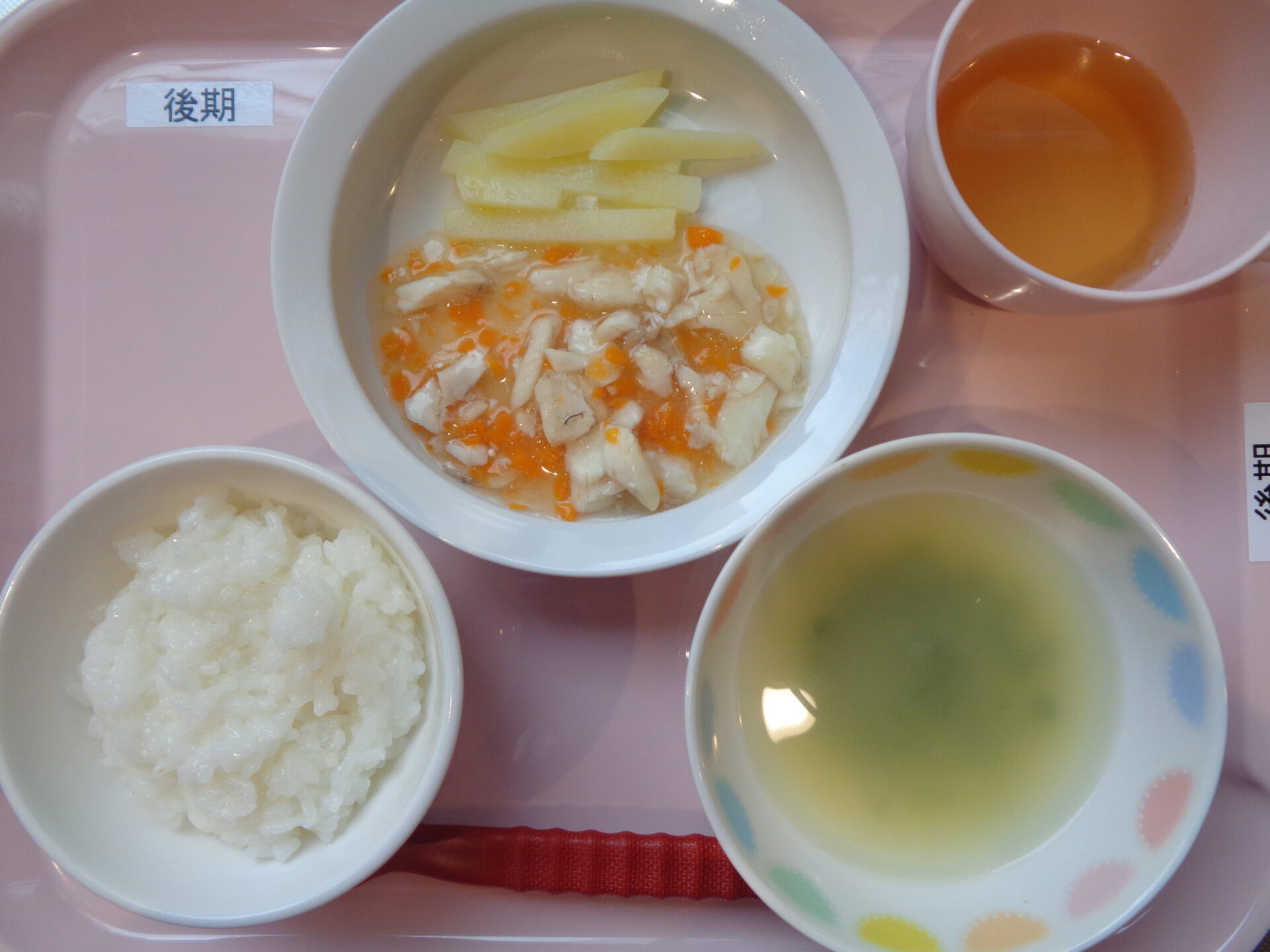 2025.04.28 給食写真 4月28日(月) 【普通食】 ご飯・さばのしょうが煮・ポテトサラダ・なめこの味噌汁・オレンジ 【離乳食・後期】 軟飯・カレイと人参の煮物・じゃがいもスティック・味噌汁 一覧へ戻る