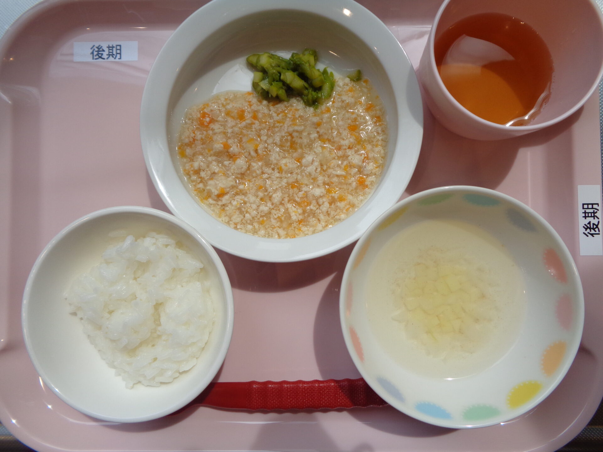 【離乳食・後期】 軟飯・鶏肉と野菜の煮物・アスパラの穂先・ポトフ