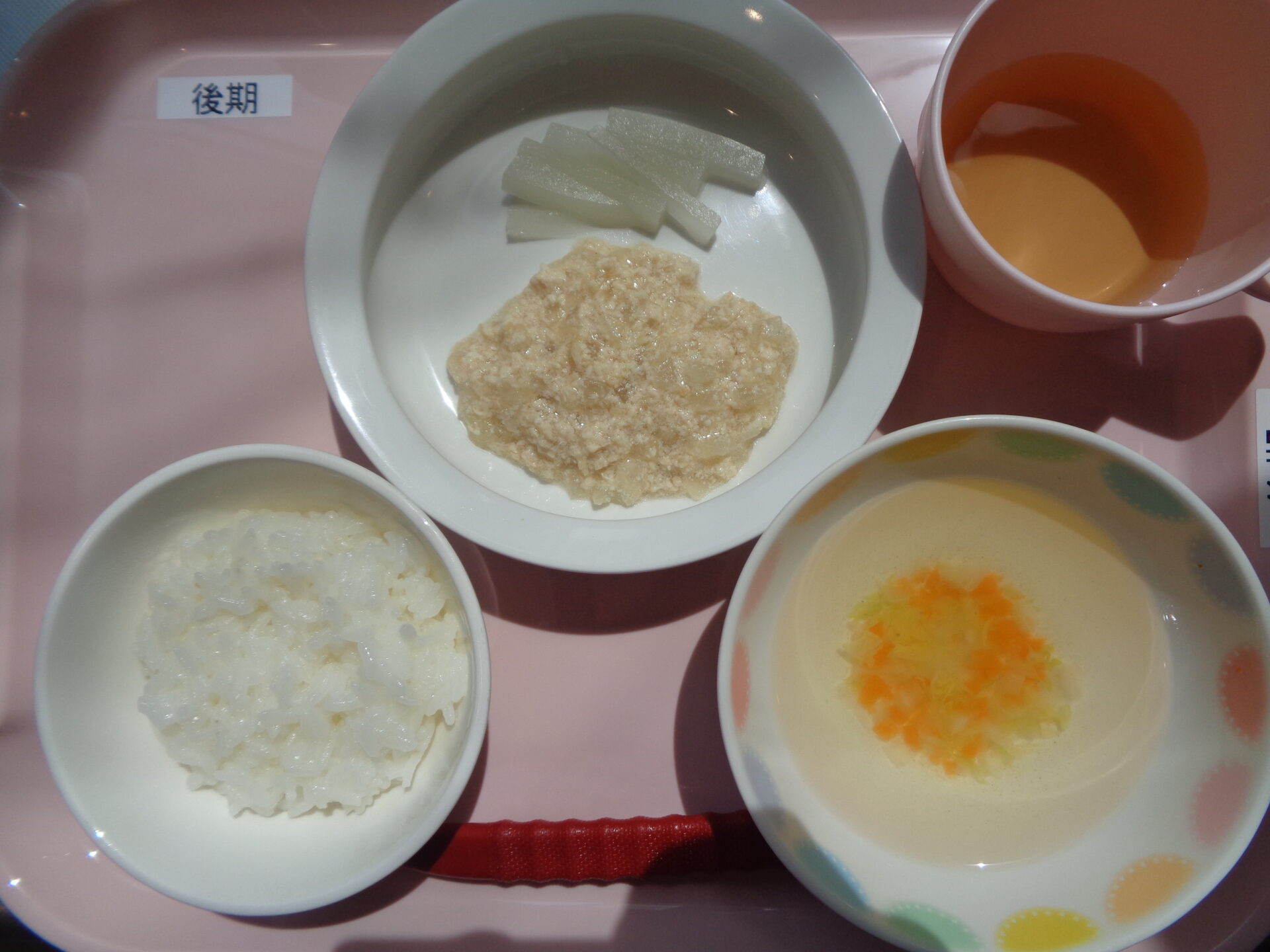【離乳食・後期】 軟飯・鶏肉のみそ煮・大根スティック・白菜のすまし汁