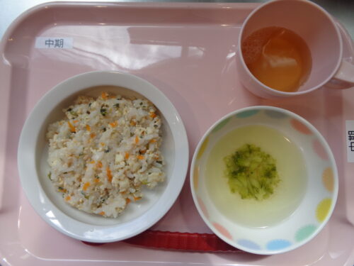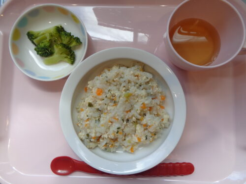 2025.05.20 給食写真 5月20日(火) 【普通食】豆腐とひじきのそぼろ丼・ブロッコリーサラダ・すまし汁 【離乳食・後期】五目雑炊・ブロッコリースティック 【離乳食・中期】五目雑炊・ブロッコリースープ 一覧へ戻る