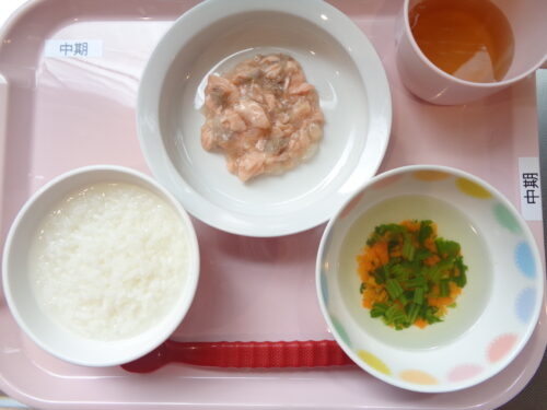 【離乳食・中期】 7倍粥・鮭の煮物・ほうれん草スープ