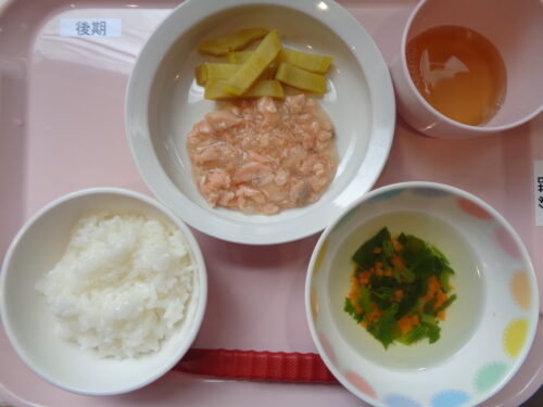 【離乳食・後期】 軟飯・鮭の煮物・さつま芋スティック・ほうれん草スープ