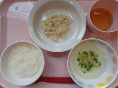 【離乳食・中期】 7倍粥・カレイとじゃが芋の煮物・小松菜のスープ
