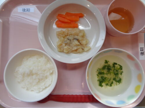 【離乳食・後期】 軟飯・カレイとじゃが芋の煮物・にんじんスティック・小松菜のスープ