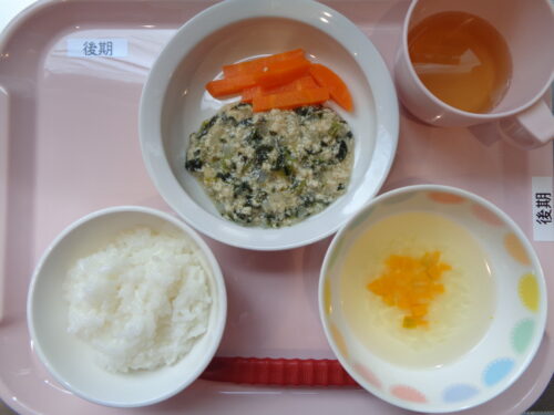 【離乳食・後期】 軟飯・鶏肉とほうれん草の煮物・にんじんスティック・かぼちゃスープ
