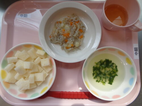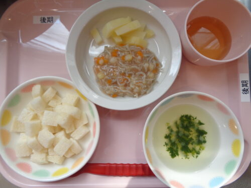 ・食パン ・しらすと野菜のトマト煮 ・じゃが芋スティック ・ほうれん草スープ
