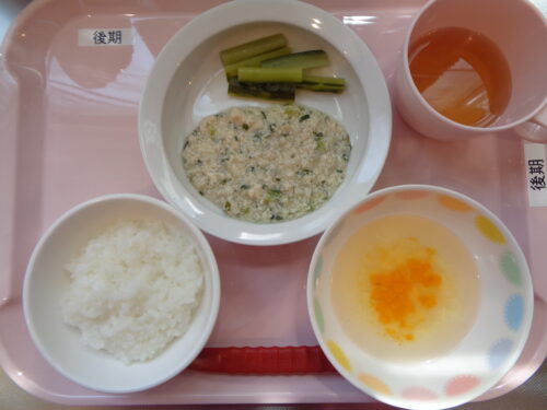 【離乳食・後期】 軟飯・鶏肉と小松菜の煮物・きゅうりスティック・かぼちゃスープ