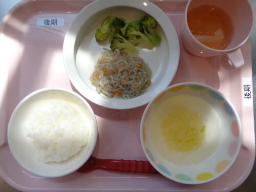 【離乳食・後期】 軟飯・しらすのうま煮・ブロッコリースティック・白菜スープ