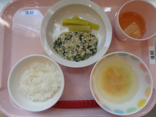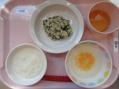 ・7倍粥 ・鶏肉とほうれん草の煮物 ・キャベツのすまし汁