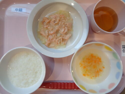 【離乳食・中期】 7倍粥・鮭とじゃが芋の煮物・野菜スープ