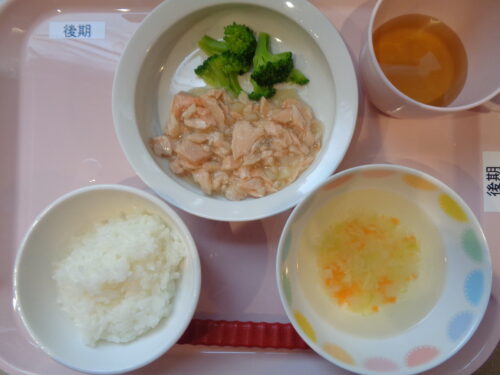 【離乳食・後期】 軟飯・鮭とじゃが芋の煮物・ブロッコリースティック・野菜スープ