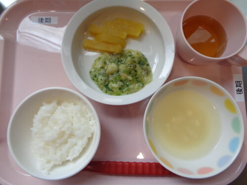 【離乳食・後期】 軟飯・カレイと小松菜の煮物・さつまいもスティック・豆腐の味噌汁