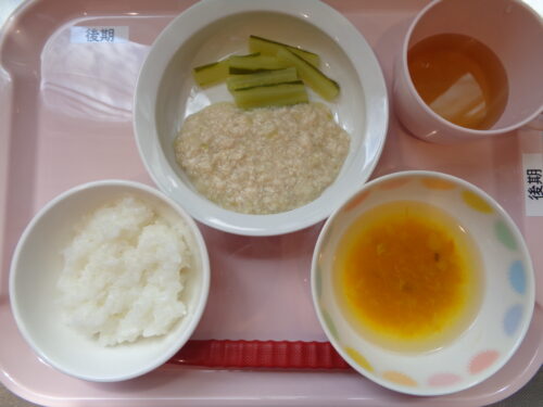 【離乳食・後期】 軟飯・鶏肉とキャベツの煮物・きゅうりスティック・玉ねぎスープ