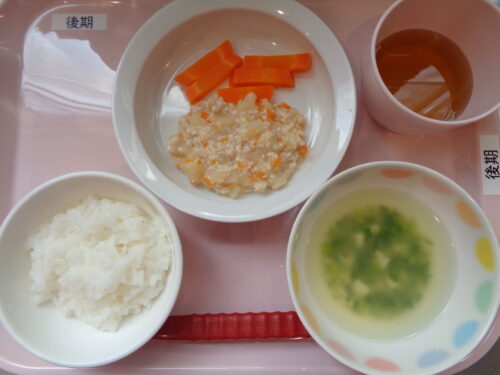 【離乳食・後期】 軟飯・鶏肉とじゃが芋のうま煮・にんじんスティック・豆腐の味噌汁