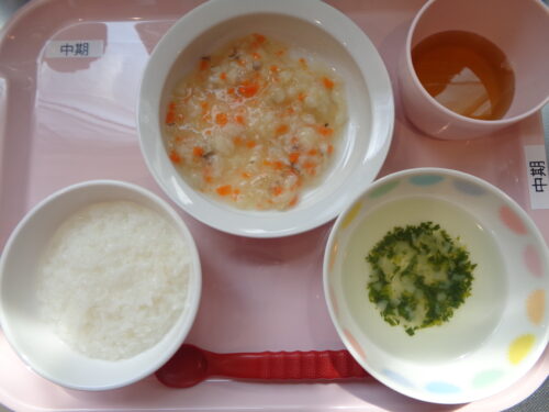 【離乳食・中期】 7倍粥・カレイと人参の煮物・ほうれん草スープ