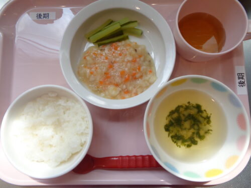 【離乳食・後期】 軟飯・カレイと人参の煮物・きゅうりスティック・ほうれん草スープ