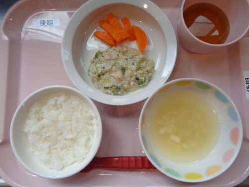 【離乳食・後期】 軟飯・鶏肉とブロッコリーのうま煮・にんじんスティック・豆腐の味噌汁
