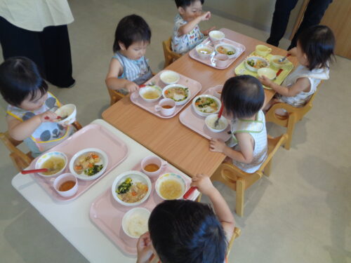 食べ始めたばかりの、だいち組(1歳児)の給食風景です。