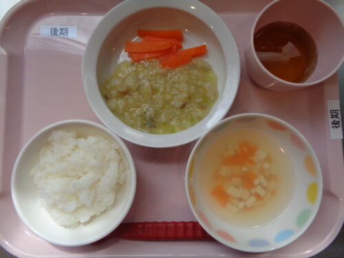 【離乳食・後期】 軟飯・カレイとキャベツの煮物・にんじんスティック・豆腐のすまし汁