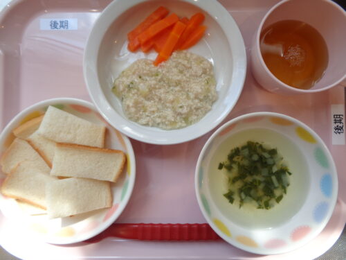 【離乳食・後期】 食パン・鶏肉と玉ねぎの煮物・にんじんスティック・ほうれん草スープ