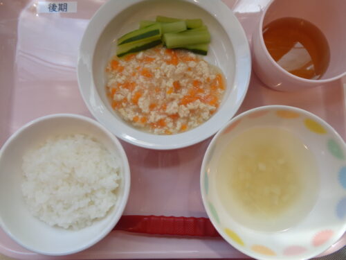【離乳食・後期】 軟飯・鶏肉と野菜の煮物・きゅうりスティック・じゃがいもの味噌汁