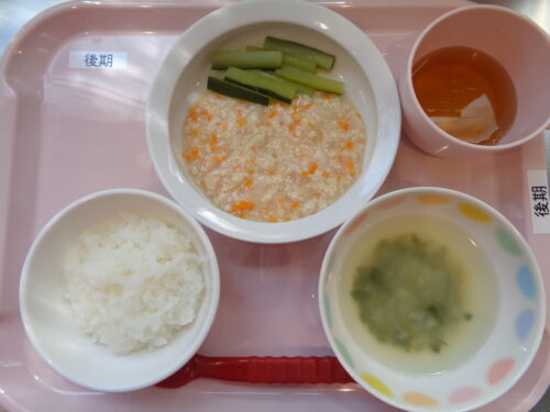 【離乳食・後期】 軟飯・鶏肉とにんじんのだし煮・きゅうりスティック・小松菜の味噌汁