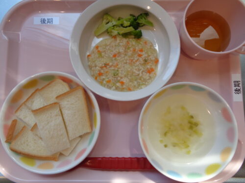【離乳食・後期】 食パン・鶏肉とキャベツの煮物・ブロッコリースティック・なすのスープ