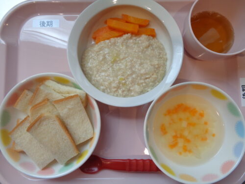 2025.08.12 給食写真 8月 12日(火) 【普通食】 食パン・鶏肉のカレー焼き・スパゲティサラダ・ポトフ風スープ 【離乳食・後期】 食パン・鶏肉とキャベツの煮物・にんじんスティック・ポトフ風スープ 一覧へ戻る