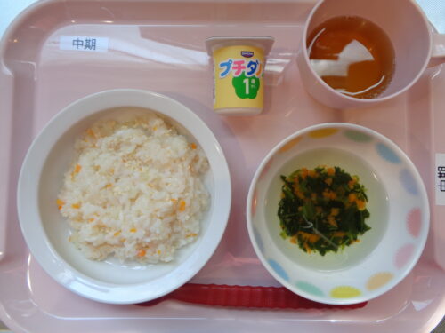 2025.08.18 給食写真 8月 18日(月) 【普通食】・ひき肉カレー・キャロットラペ・ヨーグルト 【離乳食・後期】・とり雑炊・ほうれん草スープ・ベビーヨーグルト 【離乳食・中期】・とり雑炊・ほうれん草スープ・ベビーヨーグルト 一覧へ戻る