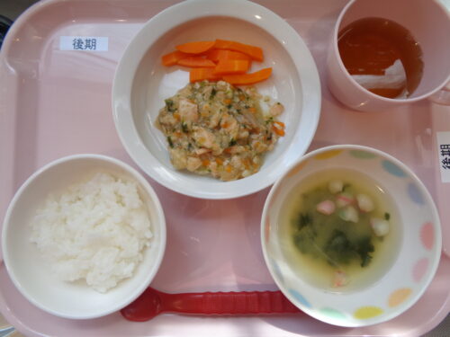 2025.08.26 給食写真 8月 26日(火) 【普通食】・ご飯・さわらの煮つけ・もやしと竹輪のサラダ・麩の味噌汁・みかん缶 【離乳食・後期】・軟飯・鮭と大根の煮物・にんじんスティック・麩の味噌汁 一覧へ戻る