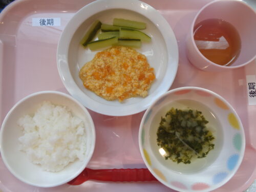 2025.09.03 給食写真 9月3日(水) 【普通食】・ご飯・ポークチャップ・切干大根としらすの和え物・野菜スープ 【離乳食・後期】・軟飯・鶏肉とかぼちゃの煮物・きゅうりスティック・ほうれん草スープ 一覧へ戻る