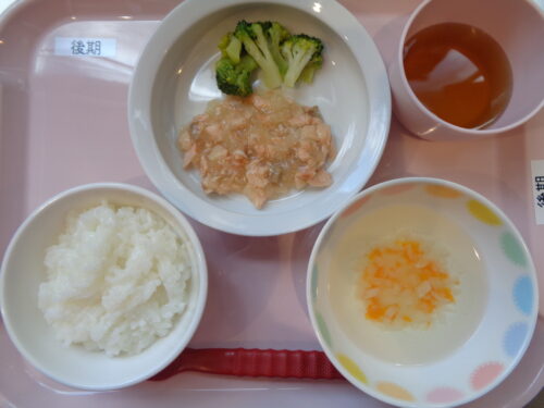 2025.09.09 給食写真 9月9日(火) 【普通食】・ご飯・さばのみりん漬け・大根サラダ・はんぺんのすまし汁 【離乳食・後期】・軟飯・鮭と大根の煮物・ブロッコリースティック・玉ねぎスープ 一覧へ戻る