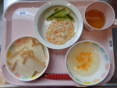 【離乳食・後期】・食パン・鶏じゃが・きゅうりスティック・コンソメスープ